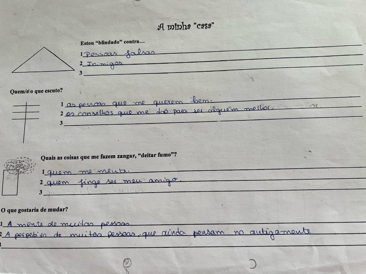 Este foi um trabalho particularmente difícil de fazer, porque nunca tinha parado para pensar nestas coisas, Agora que fiz isto fiquei a perceber uma coisa, os meus animais e a minha família são sem dúvidas as pessoas mais importantes da minha vida. Quero longe de mim pessoas que não me querem bem, porque na minha vida não preciso de inimigos nem quem me deseje mal.