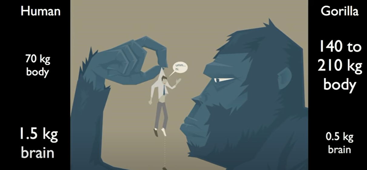 Outro exemplo, apresentado por Suzana é o facto da nossa comparação para com os macacos/ gorilas, porém como podemos observar na figura, o gorila é enorme ao pé de um ser humano, ou seja, se o gorila é tão grande deveria ter um cérebro enorme, mas acontece que não tem, o nosso é três vezes maior do que o do animal.
